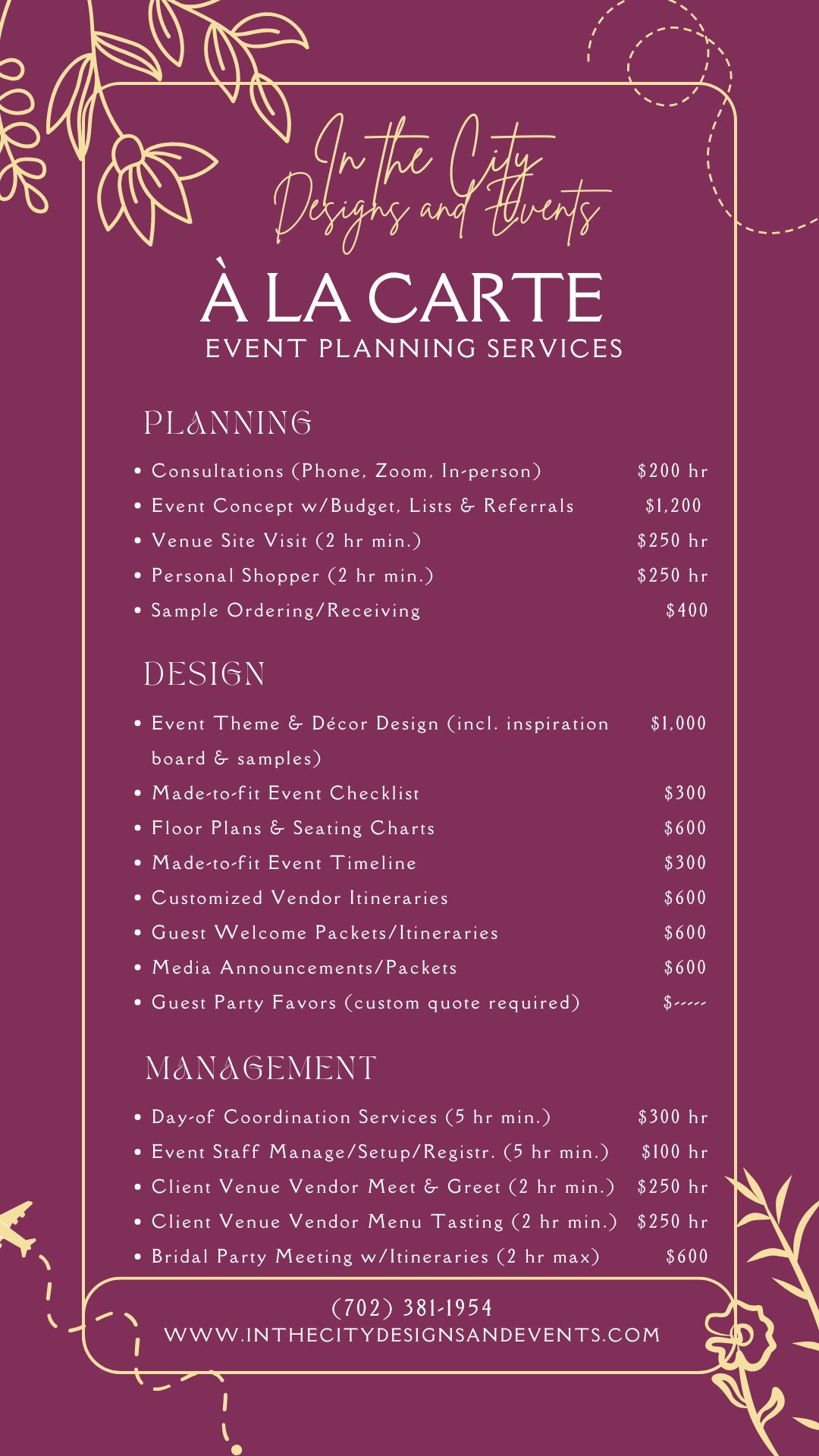 À La Carte event planning services allows you to have complete control over the level of support you receive. You choose only the essential assistance needed to flawlessly execute your event, from start to finish. Let us exceed your expectations by providing peace of mind and made-to-fit planning services.